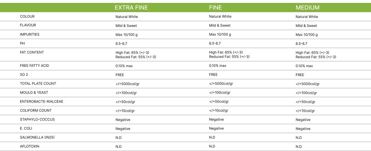 Depending on the fat content, our desiccated coconut is available in High Fat (Medium and Fine grains).